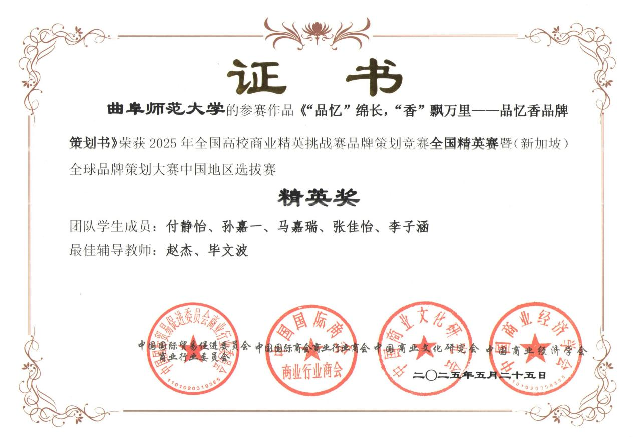 经济学院讯 日前,2025年全国高校商业精英挑战赛品牌策划大赛落下帷幕,曲阜师大经济学院2022级学生孙嘉一团队以优异成绩荣获全国总决赛一等奖,并从众多一等奖团队中突出重围获得全国精英奖,创造了曲阜师大学生在该项赛事中的最好成绩。