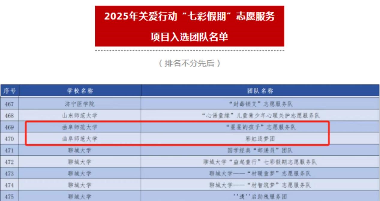 2025年关爱行动“七彩假期”志愿服务团曲阜师大入选团队公示名单