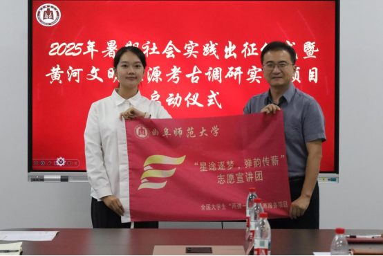 在随后的授旗环节,团委书记孔轶众和历史文化学院党委书记姜开勇共同为国家级社会实践代表队授旗,历史文化学院副院长王京传为学院重点实践队伍授旗,正式拉开了2025年暑期社会实践活动的序幕
