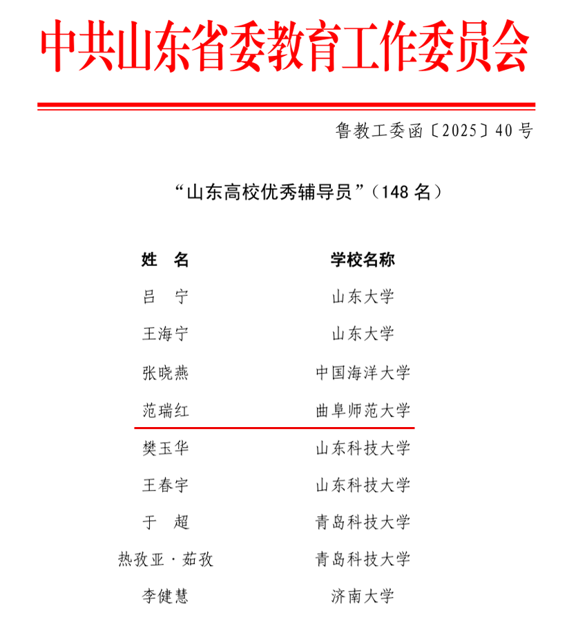 学生工作处讯 近日,中共山东省委教育工委公布了2024年山东“十佳百优”高校辅导员评选结果,曲阜师大网络空间安全学院党委副书记范瑞红荣获“山东高校优秀辅导员”荣誉称号。