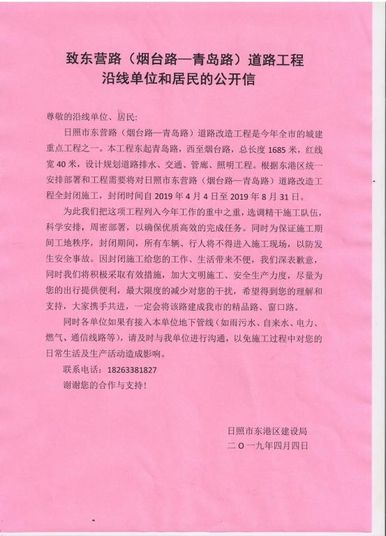 日照市东港区将对东营路(烟台路—青岛路段)进行道路改造,全线封闭施工,封闭时间为2019年4月5日至2019年8月31日。经学校研究决定,自2019年4月5日起校区南门、图书馆南门封闭直至工程结束。请各位师生员工从校区其它各门出入。