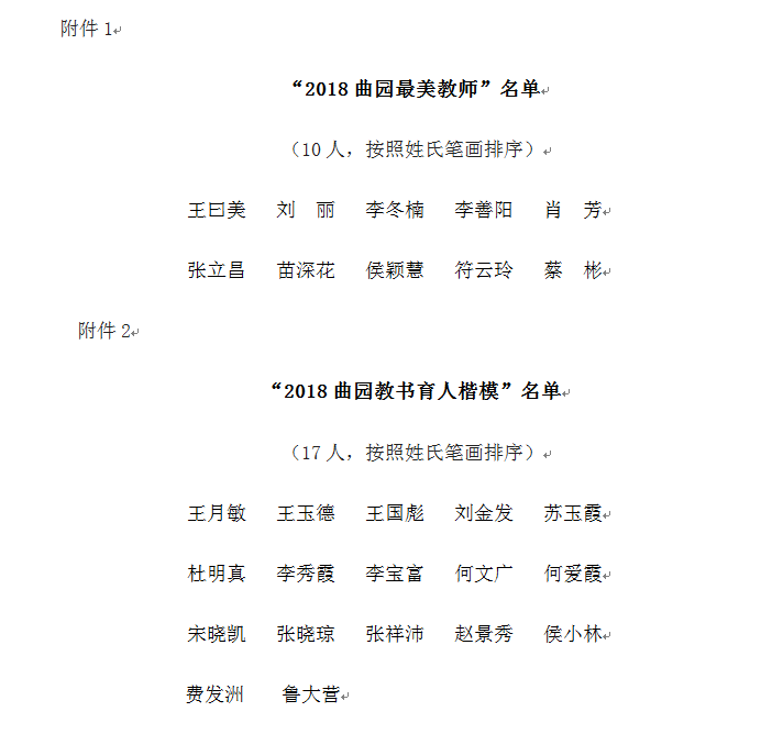 根据《中共山东省委宣传部 中共山东省委教育工委 山东省教育厅关于开展“2018 齐鲁最美教师”评选活动的通知》(鲁教师字〔2018〕7 号)精神和我校《关于开展“2018 齐鲁最美教师”推荐评选活动的通知》的要求,按照评选程序,经学院推荐,网络评议和会议评审等方式,评选出 “2018曲园最美教师” 10名和“2018曲园教书育人楷模” 17名,现予公示,请予监督。