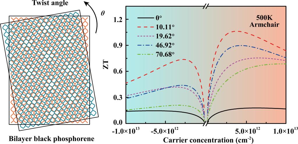 热电材料可实现热能与电能之间的直接转化,在废热回收、解决能源危机、降低环境污染等领域具有重要经济价值与社会意义。热电转化效率主要由品质因子ZT值决定,各物理参数之间存在复杂的强耦合联系,为研发高性能热电材料带来了极大挑战。黑磷独特的层状晶体结构,使其同时具备本征高载流子迁移率、随层数可调的能带带隙、层内及层间物性的强各向异性等特点,对解耦材料的电声耦合存在先天优势。自2019年起,刘晓兵教授团队利用第一性原理计算模拟,通过第五主族元素掺杂(Adv. Funct. Mater. 29(38), 1904346, 2019)、不同原子层数磷烯薄膜调控(Vacuum 183, 109790, 2021)、一维化(Small 16, 2001820, 2020)及构建异质结(ACS Appl. Mater. Interfaces 13, 18800, 2021)等多种手段,揭示了黑磷基材料沿特定方向(Armchair或Zigzag)具有高热电转换效率,首先从理论上预言了黑磷及其衍生结构具备成为无毒、轻质、柔性高性能热电材料的巨大潜力。