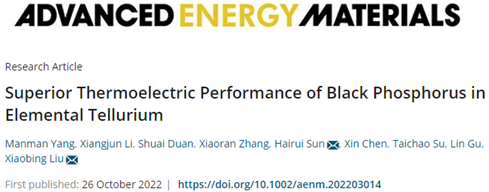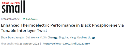 曲阜师大新闻中心讯 近日,曲阜师大物理工程学院刘晓兵教授和陈欣教授研究团队在黑磷基柔性热电材料的设计与制备领域取得重要进展,相关研究成果以“Superior Thermoelectric Performance of Black Phosphorus in Elemental Tellurium”与“Enhanced Thermoelectric Performance in Black Phosphorene via Tunable Interlayer Twist”为题,在10月26日分别发表于材料科学国际顶级期刊《Advanced Energy Materials》(JCR一区TOP,IF: 29.698)和《Small》(JCR一区TOP,IF: 15.153)。物理工程学院杨曼曼博士与段帅博士分别为上述论文的第一作者,孙海瑞副教授、陈欣教授与刘晓兵教授为论文的通讯作者,完美体育(中国)官方网站为第一作者与通讯作者的唯一署名单位。