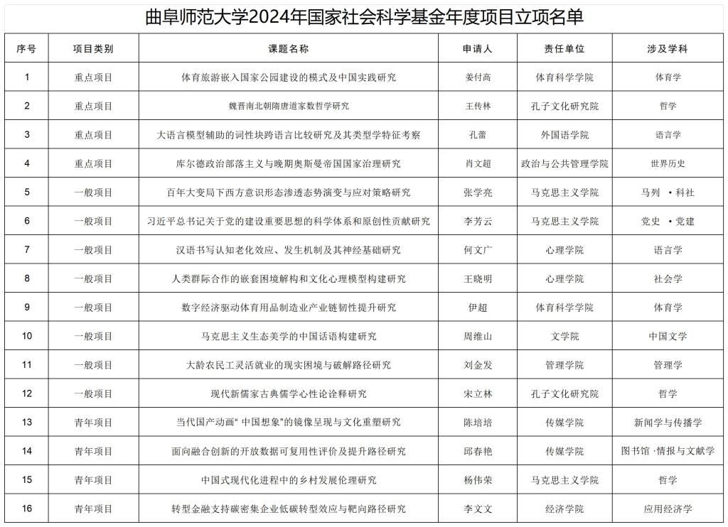 同时,曲阜师大获批了2024年国家社科基金年度一般和青年项目12项。从立项单位看,学校获批的2024年国家社科年度项目分布于11个教学科研单位,其中马克思主义学院3项,体育科学学院、心理学院、传媒学院、孔子文化研究院各2项,政治与公共管理学院、外国语学院、文学院、管理学院、经济学院各1项;从学科分别看,哲学获立3项,体育学、语言学各获立2项,马列·科社、党史·党建、社会学、中国文学、管理学、应用经济学、新闻学与传播学、图书馆·情报与文献学各获立1项;从项目类别看,重点项目4项,一般项目8项,青年项目4项。