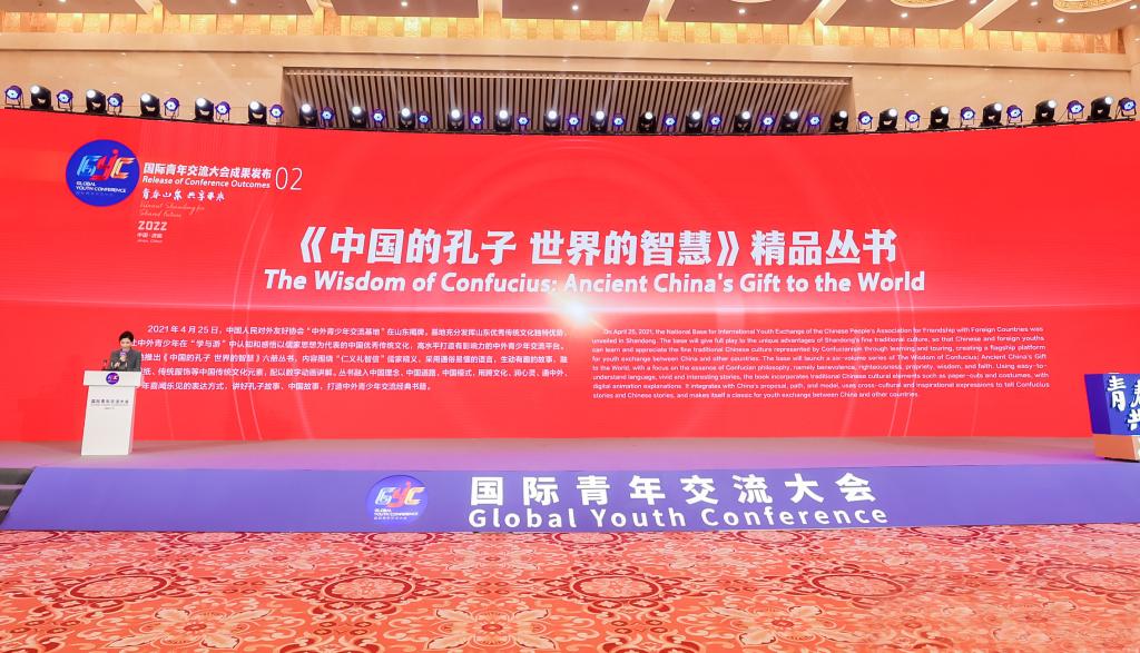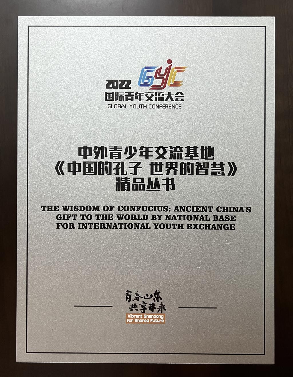 曲阜师大新闻中心讯(通讯员:孙祥广)2022年5月13日,由山东省人民政府、中国人民对外友好协会、中华全国青年联合会、中国宋庆龄基金会主办的国际青年交流大会在济南召开,大会深入贯彻习近平总书记关于推动构建人类命运共同体、推进国际青年交流合作的重要论述,致力于打造“永不落幕”的国际青年交流盛会。省委书记李干杰为我校中外青少年交流基地编写的《中国的孔子 世界的智慧》精品丛书项目授牌。