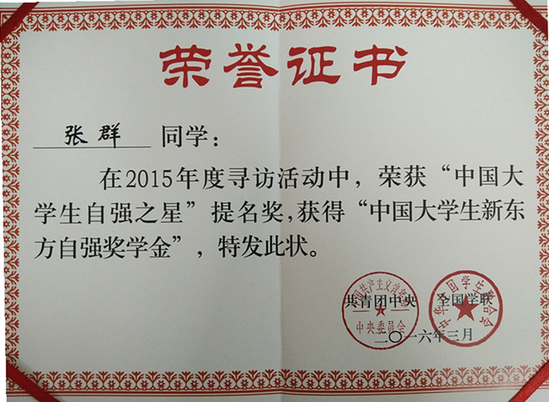 我校学子张群荣获“2015年度中国大学生自强之星”提名奖