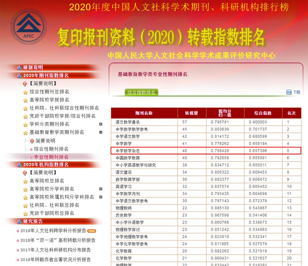 《中学数学杂志》2020年度基础教育教学类专业性期刊排名第五