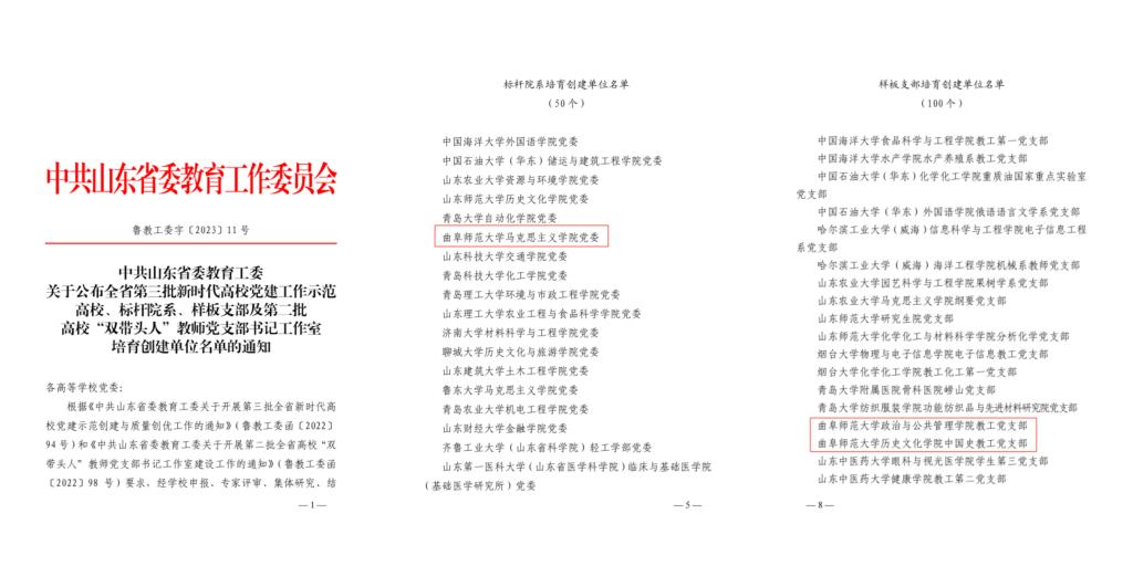 曲阜师大党委组织部讯 日前,省委教育工委公布全省第三批新时代高校党建工作示范高校、标杆院系、样板支部培育创建单位名单和首批山东高校党建“双创”和“双带头人”教师党支部书记工作室培育创建单位...